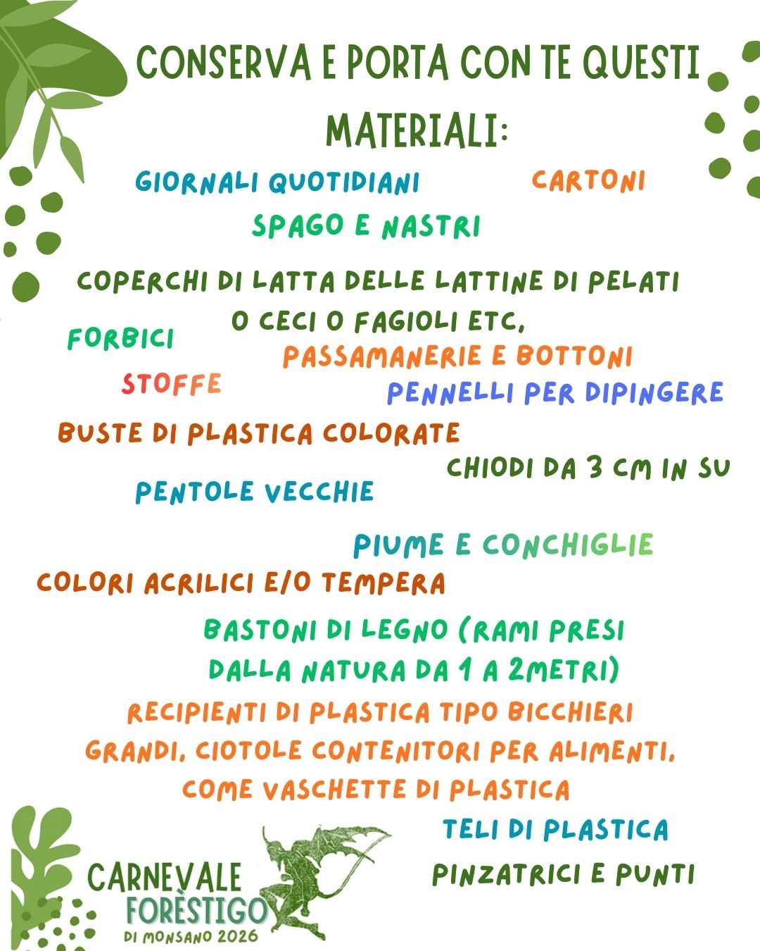 Nei giorni 12 e 13 febbraio presso la sala parrocchiale adiacente alla Chiesa di Santa Maria di Monsano, dalle 17:30 alle 20:30 si svolgeranno laboratori gratuiti aperti a tutte e tutti per costruire un grande pupazzo e maschere di cartapesta con materiali di scarto e materiali naturali sotto la regìa della burattinaia Flavia D'Aiello.