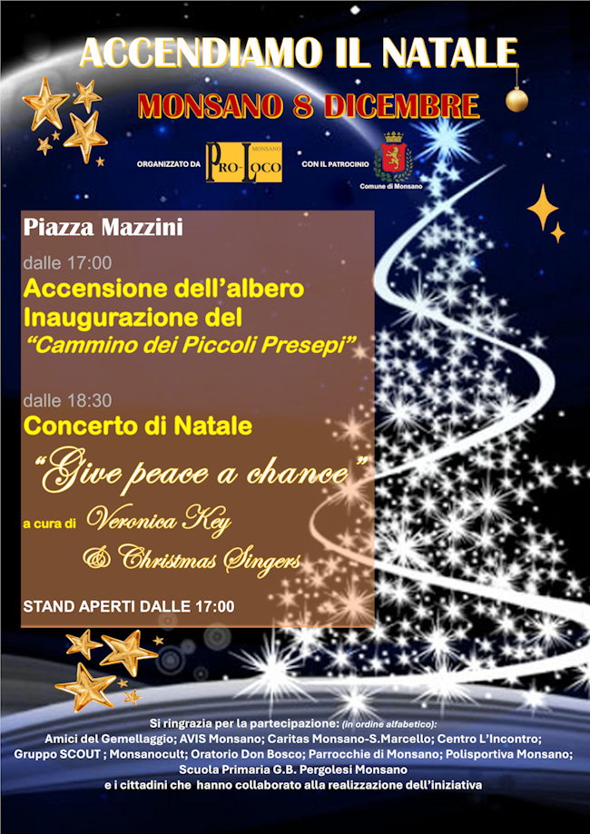 Evento proposto e gestito dalla ProLoco con il patrocinio del Comune partecipato da tutte le associazioni di Monsano, dalle scuole e da alcuni privati.